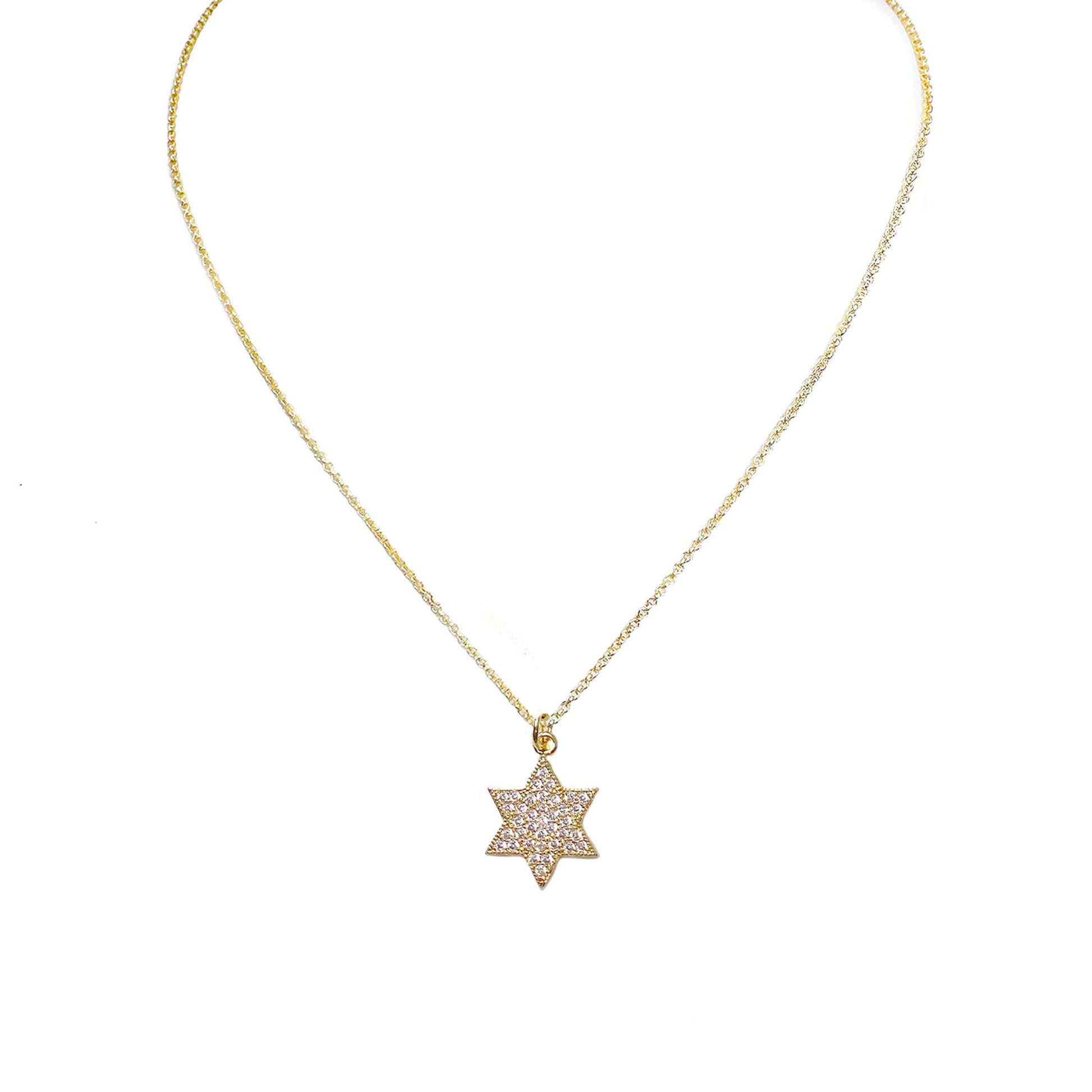 Step out in style wearing Amy's dazzling Star of David Necklace! This glamorous Pave Star of David pendant catches the eye with its chic 16" chain - dazzle 'em all no matter where you go! Shine bright like a diamond with this stunning piece! This adorable star of david measure 1/2".