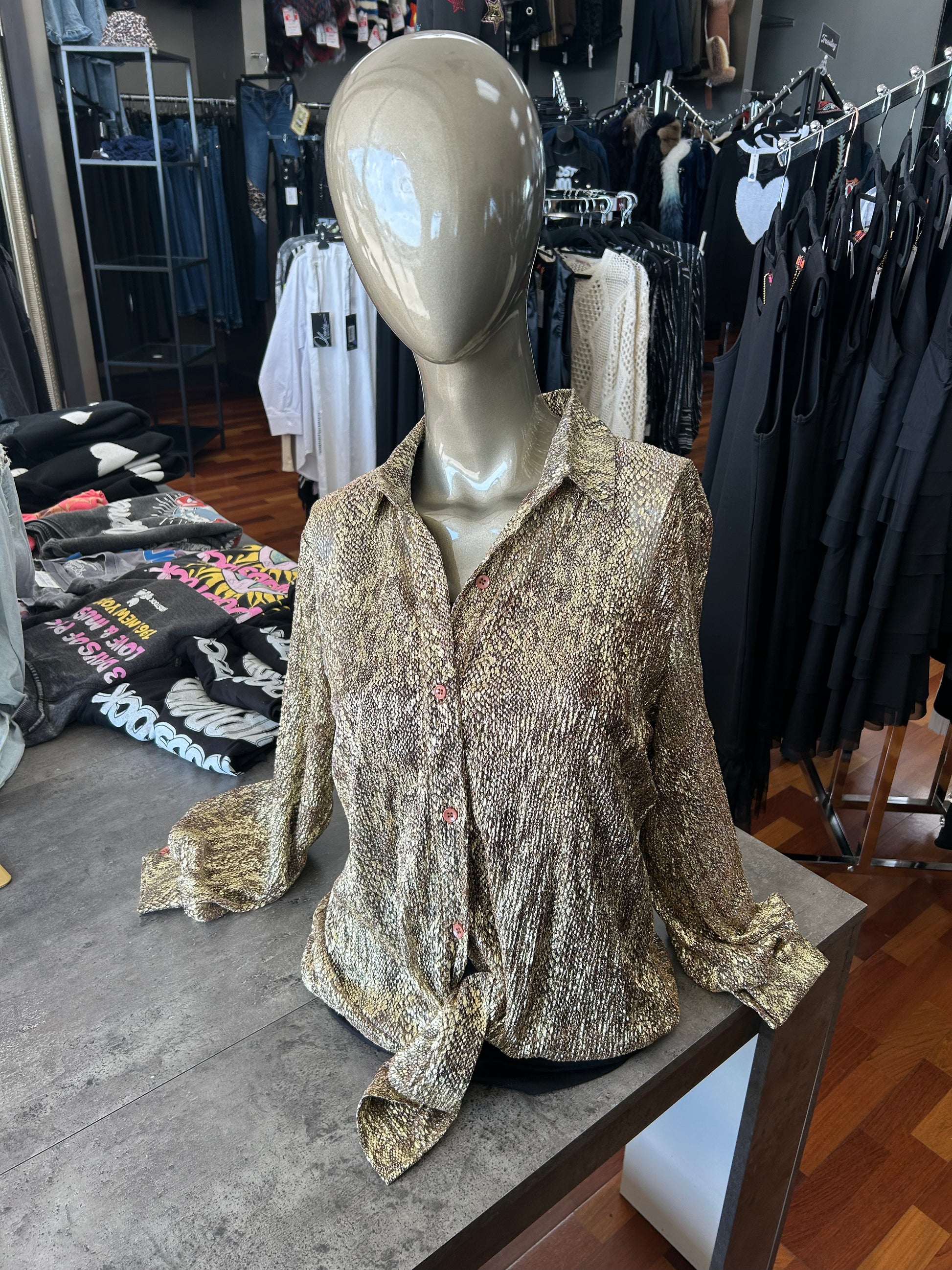 AZI Gold Lame Button Down Collared Top