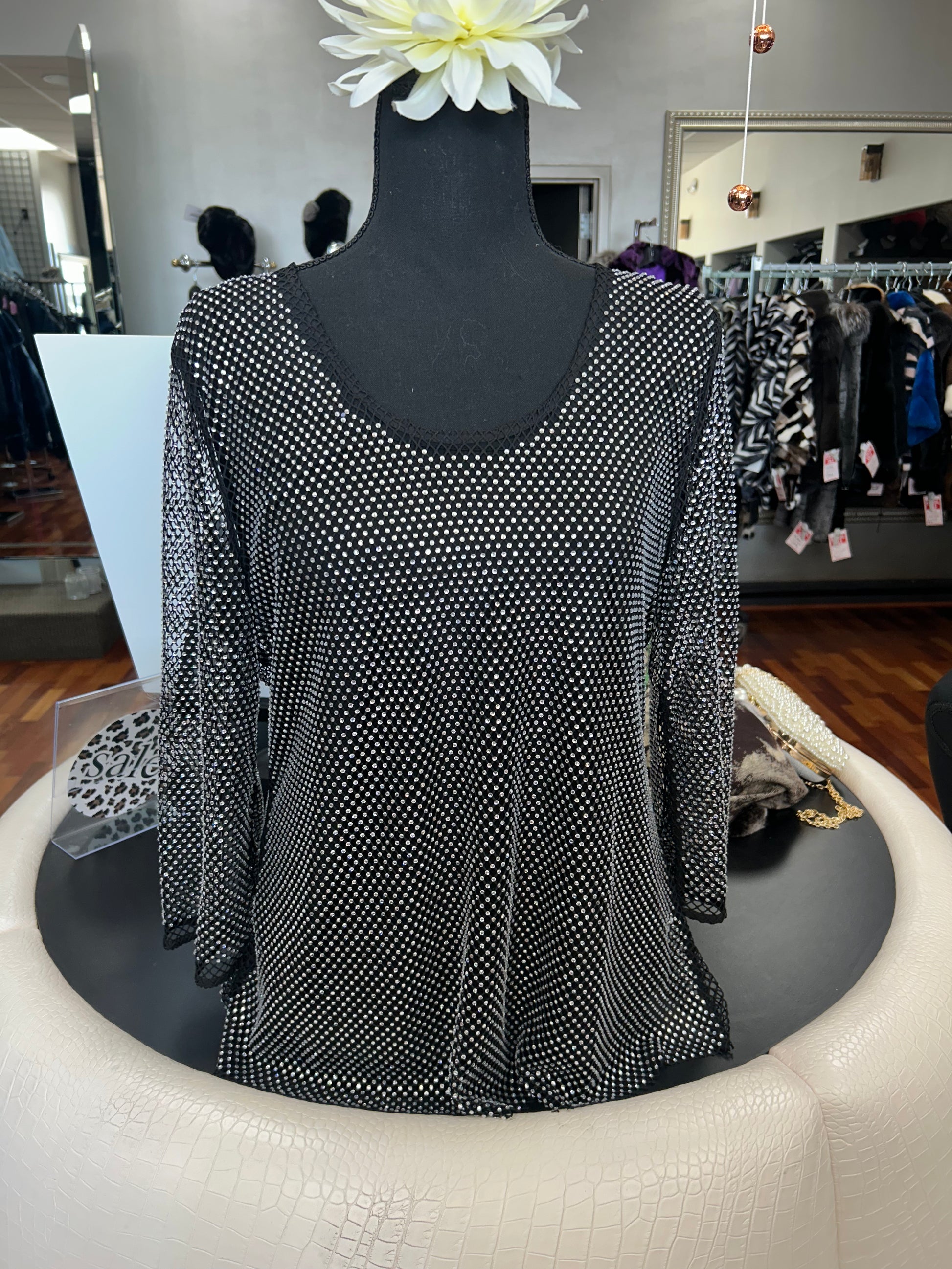 AZI Jeweled Black Two Piece 3/4 Length Sleeve Netted Top w/ Cami.