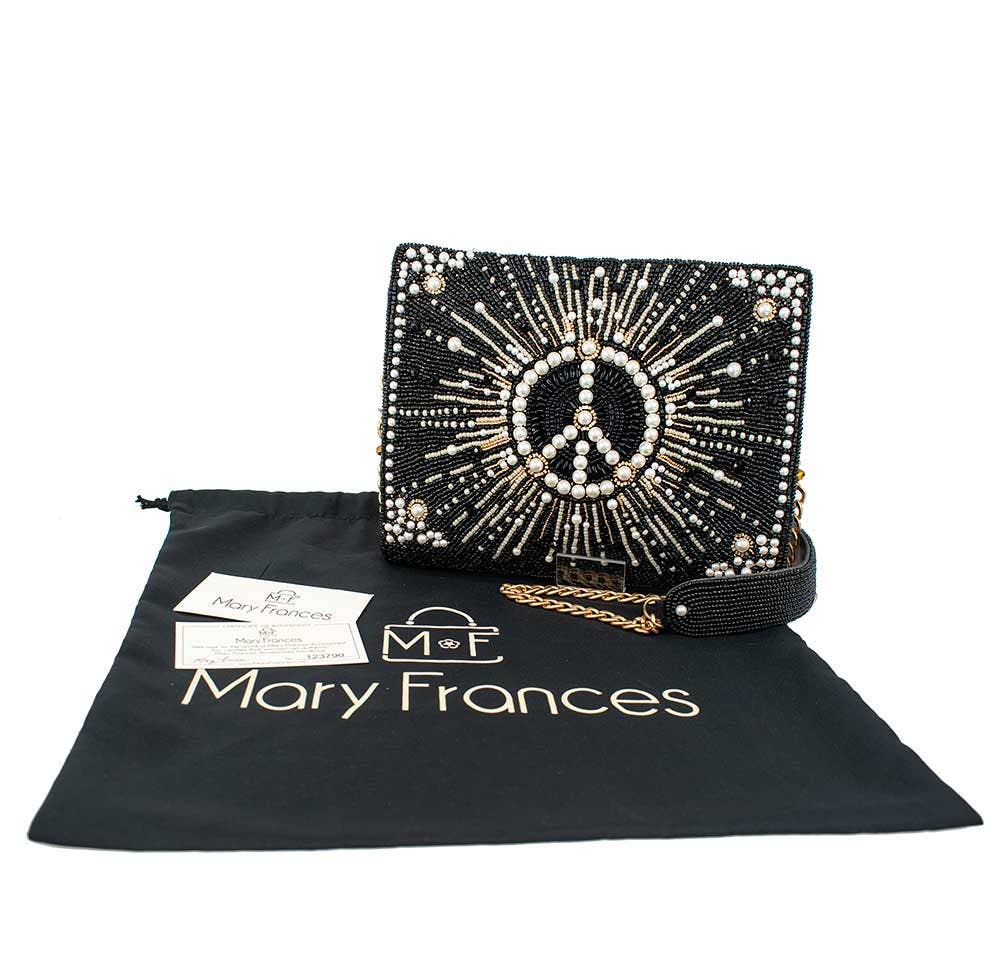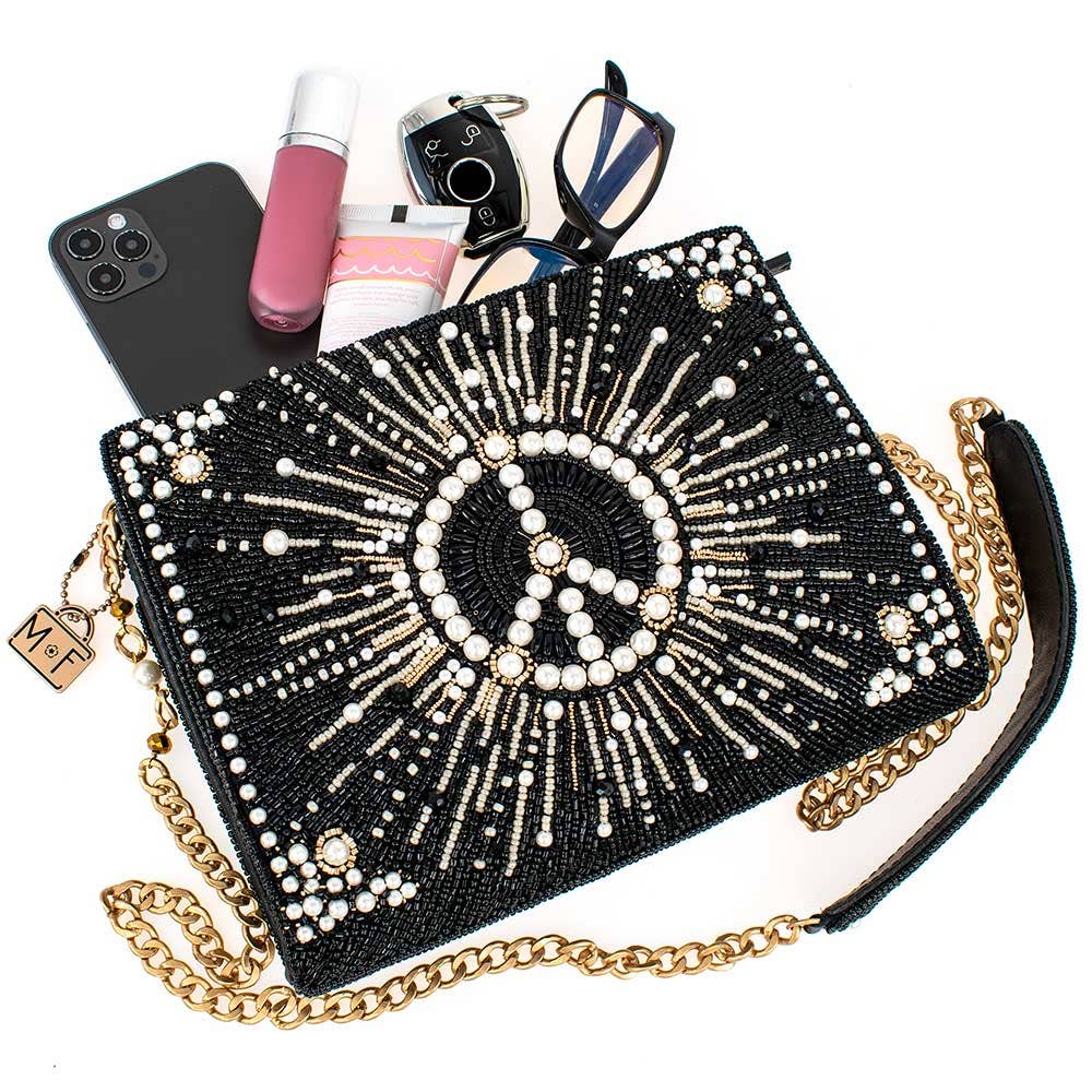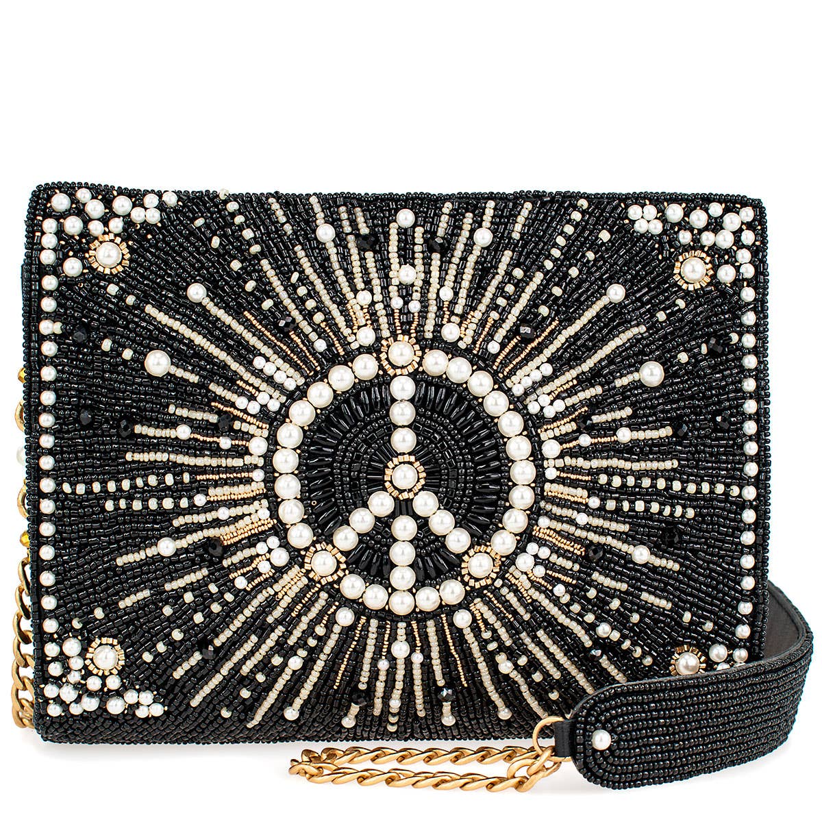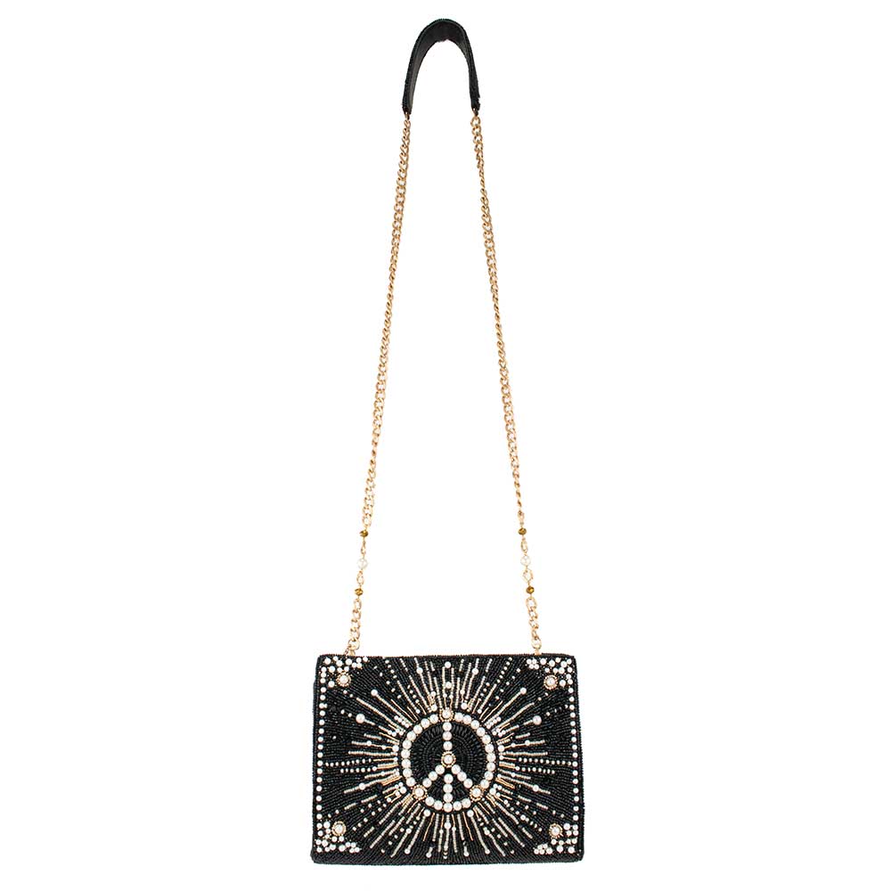 Say it with Style! Effortlessly on-trend with intricate beaded embellishment bursting from a pearl and bead peace sign, this is a must-have accessory for any fashion-forward individual. The leather sides provide plenty of space for all your essentials, combined with the secure zipper closure and removable padded-shoulder chain strap ensure both style and functionality. DIMENSIONS: 8.75 x 1.5 x 6.75", Strap Length: 49", Strap Drop: 23.25", FEATURES: Removable crossbody chain strap with beaded shoulder piece, zipper closure, inside pocket, back pocket, fits a phone, leather sides accessories,