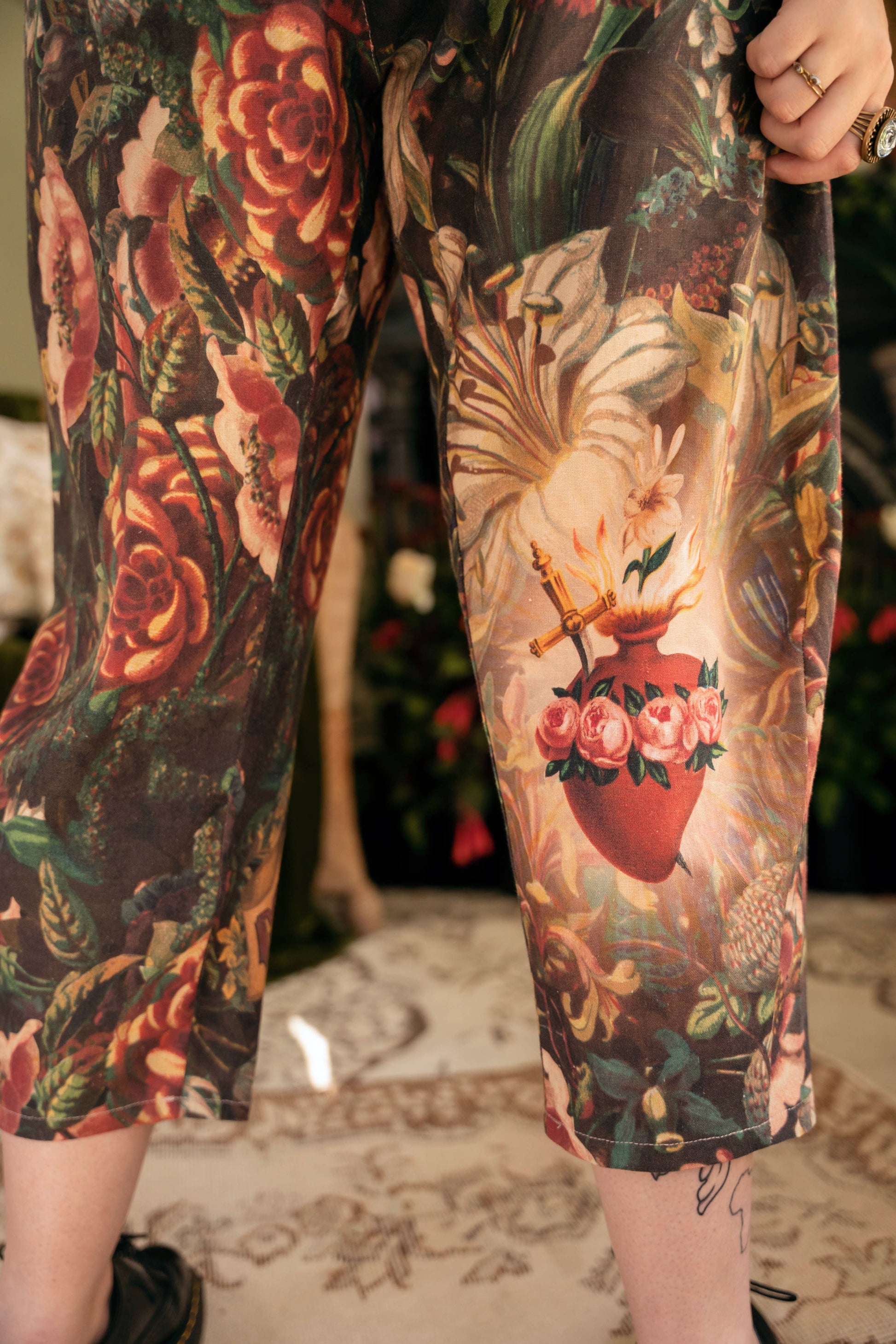 Our beautiful Artist Pants are made from a natural blend of linen and viscose, and feature a drawstring front, elastic waist back panel, pockets, cropped length, and a flattering lantern hem. The custom-woven fabric is easy-care and so comfy. About the Print: Love, faith, and courage — we designed this piece as a reminder to keep all three close when the road feels long! This print was created using archival artwork from the 1800’s — including floral wreaths & fountains from Victorian lithographs, and an 1878 hand-coloured drawing of the sacred heart of Mary. The result is a dramatic and rich print that we hope will encourage you to give yourself grace, celebrate your tenacious spirit, and always, always take heart. Approx. measurements: length 86cm/34", waist (stretched) 104cm/41" around, waist (unstretched) 84cm/32", hips 117cm/46" * boho bohemian chic artsy graphic custom fashionable trendy florals antique vintage
