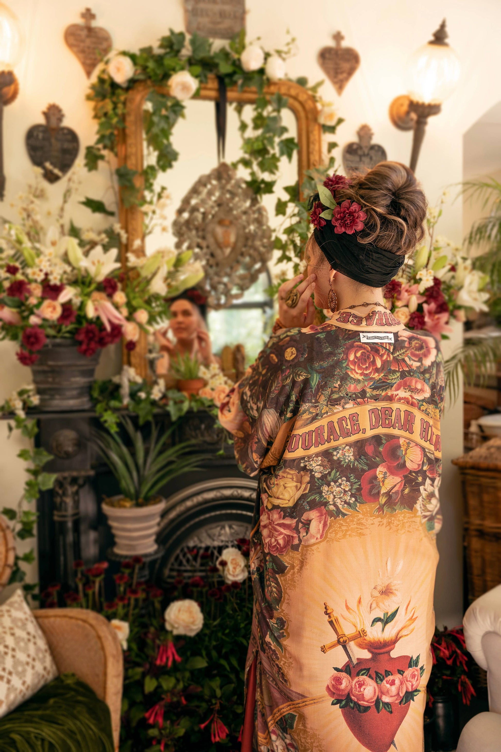 Love, faith, and courage — we designed this piece as a reminder to keep all three close when the road feels long! This unique, beautiful print was created using archival artwork from the 1800’s — including floral wreaths & fountains from Victorian lithographs, and an 1878 hand-coloured drawing of the sacred heart of Mary. The words “Love is an arrow, aim true”, and “Where your treasure is, there your heart will be also”, are hidden in the images as little talismans of strength. “Courage, Dear Heart”, repeated on the trim, was inspired by a quote from C.S. Lewis — the author of the Narnia Chronicles. The result is a dramatic and rich print!