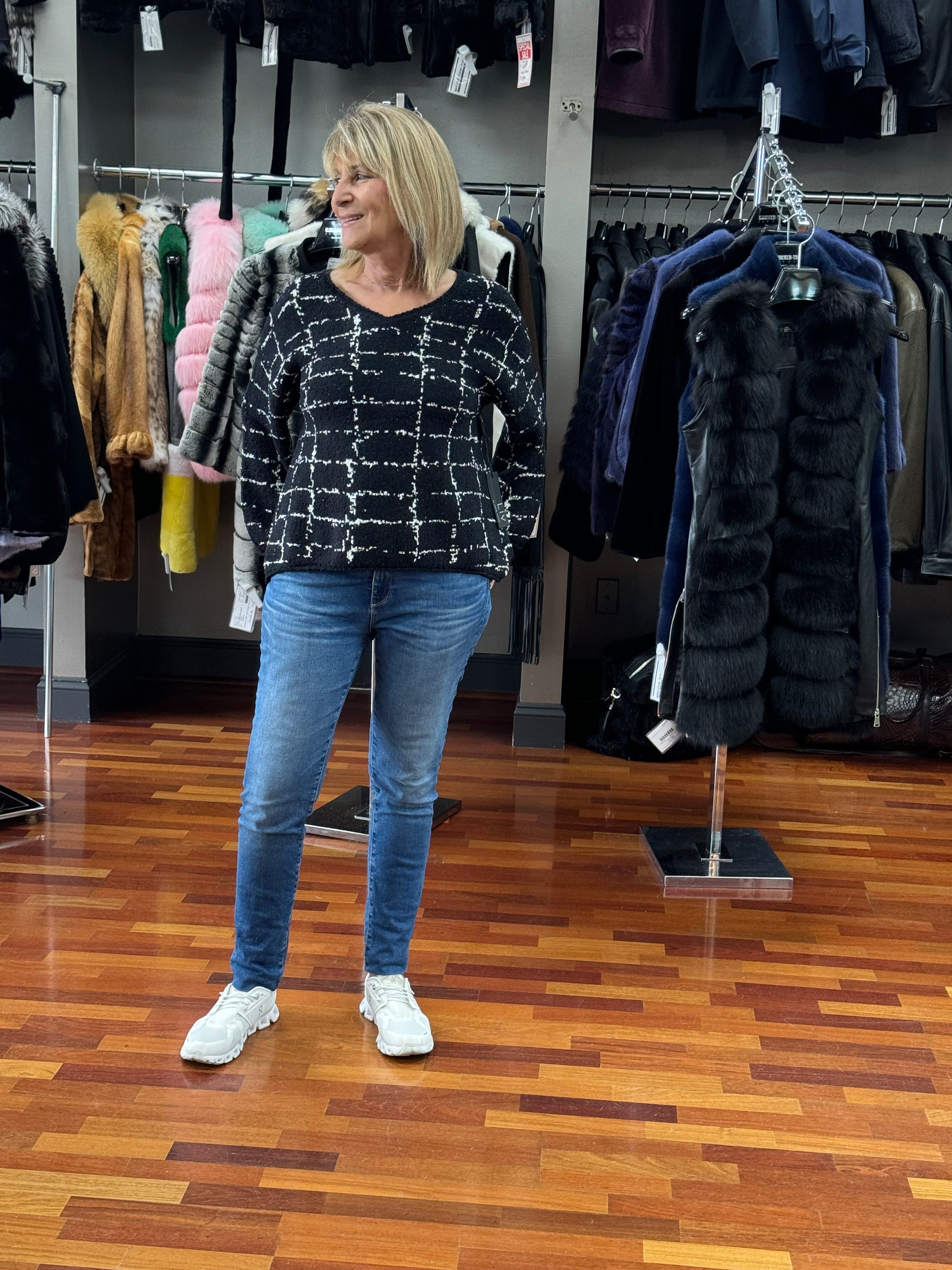 LIV Pullover Boucle Windowpane V-Neck Long Sleeve Sweater Top