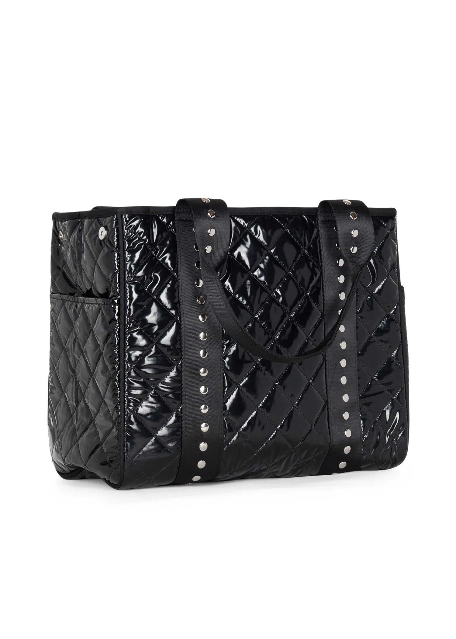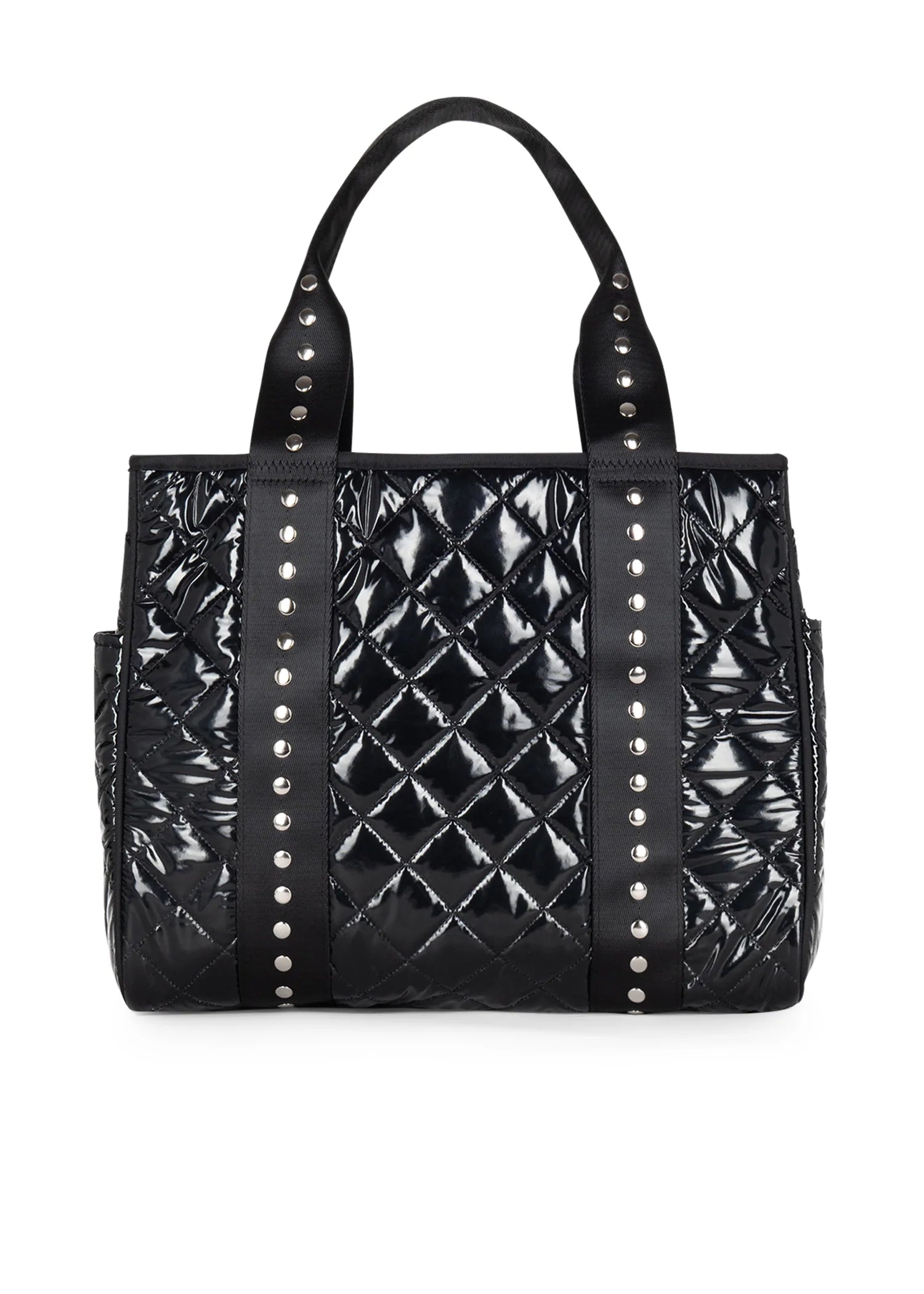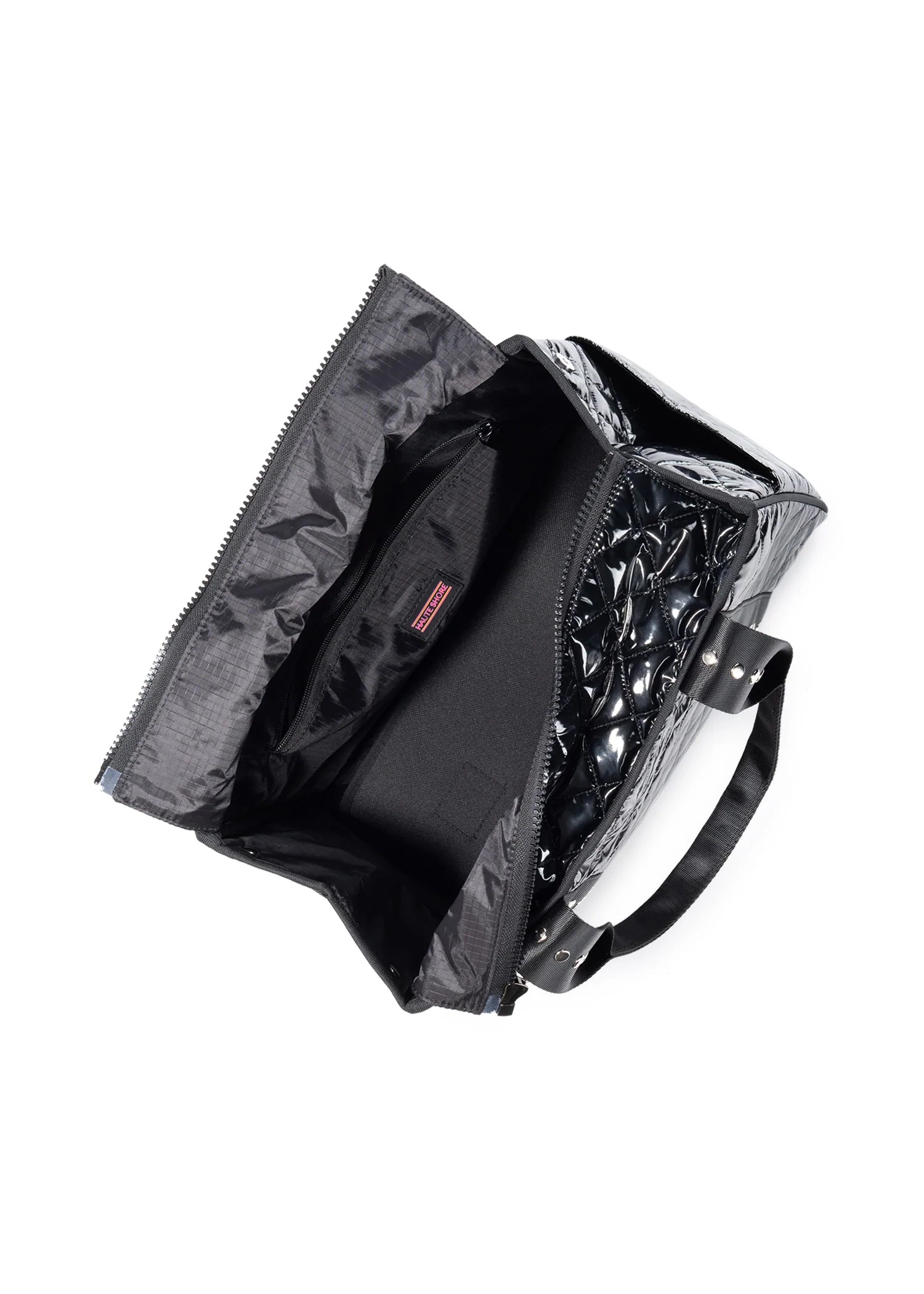 Black quilted nylon/ buff quilted leatherette puffer sides.