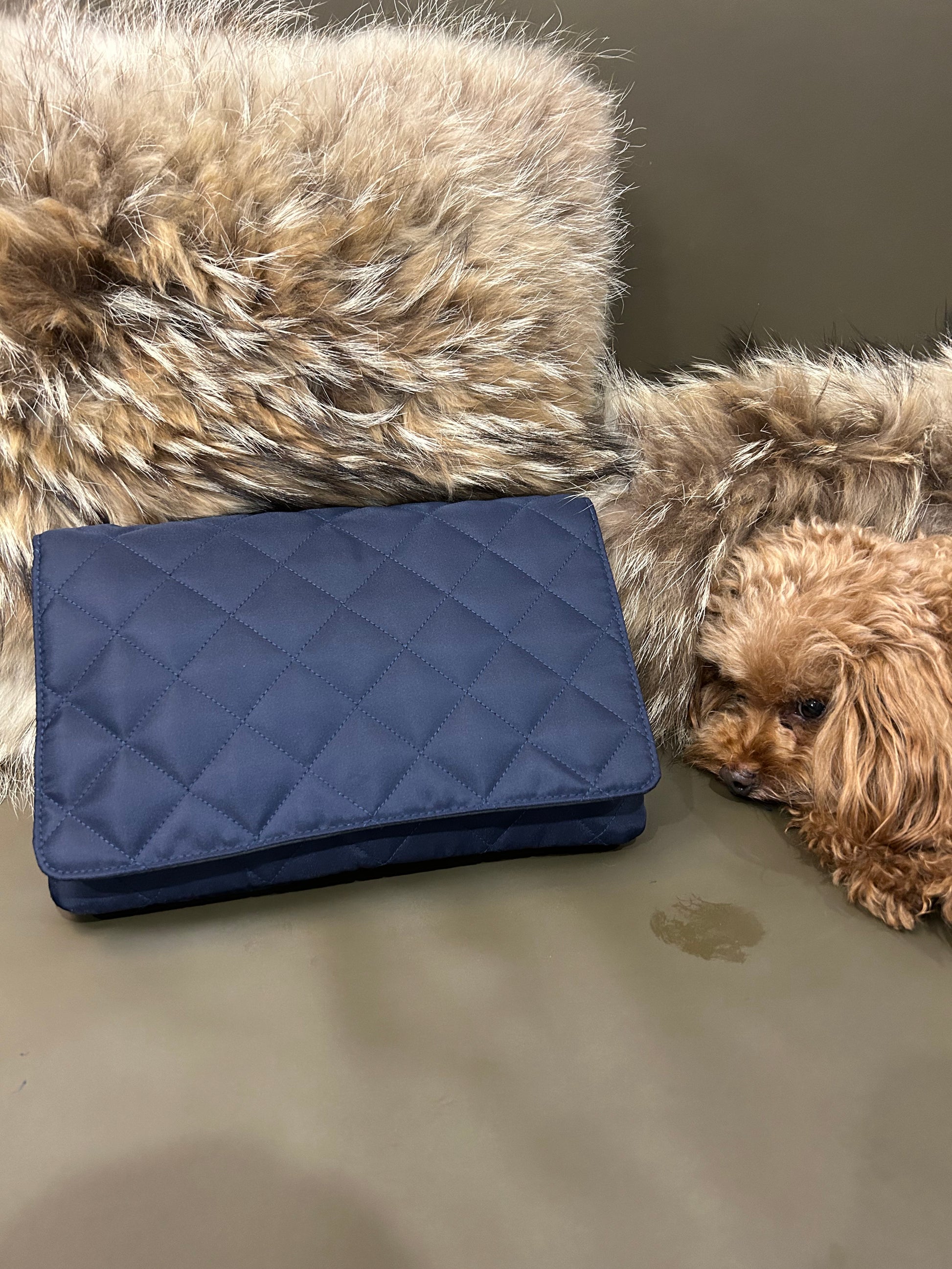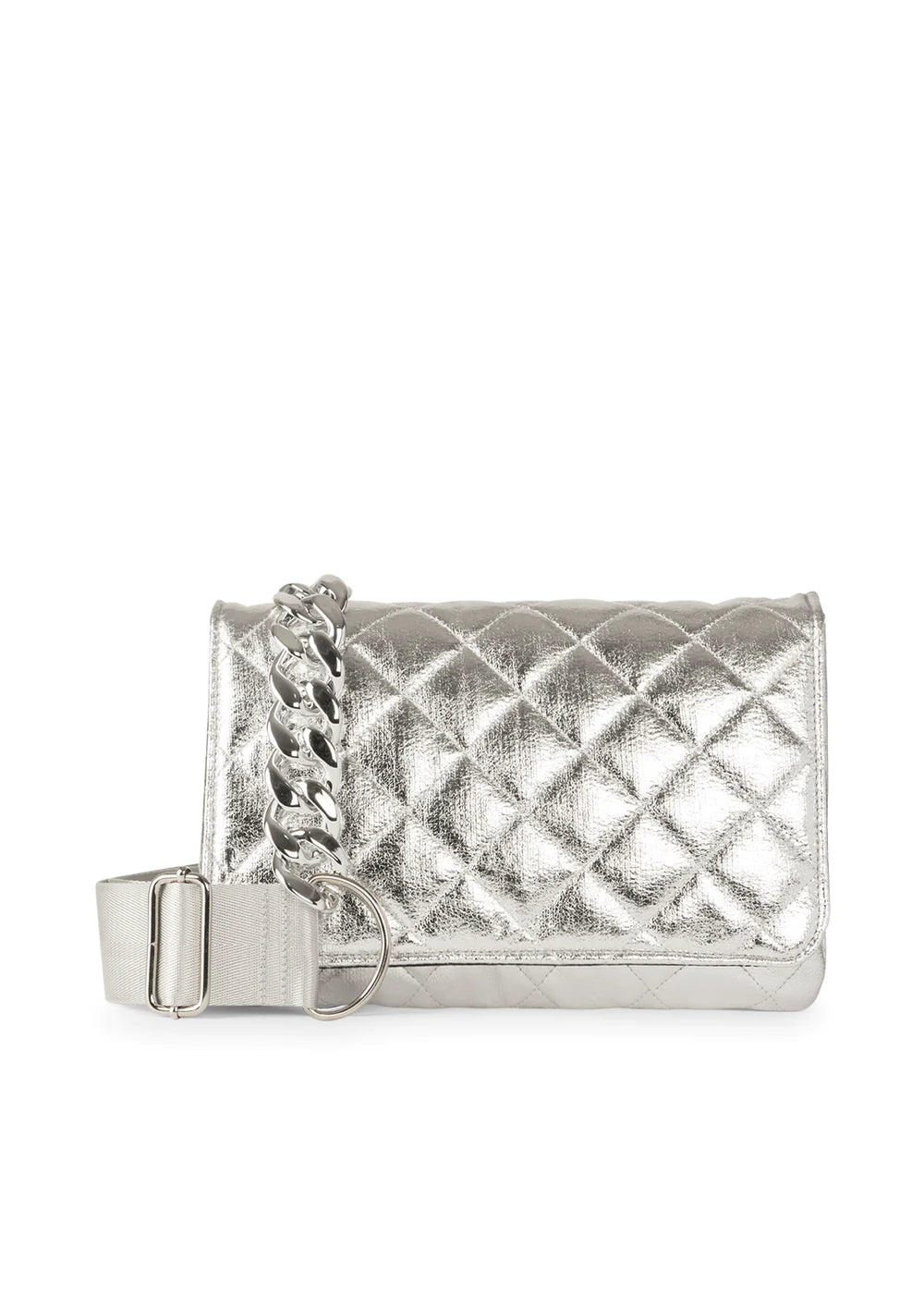 Flap crossbody with 2 accordion segments. Exterior back slip pocket. Interior slip and zip pockets.
