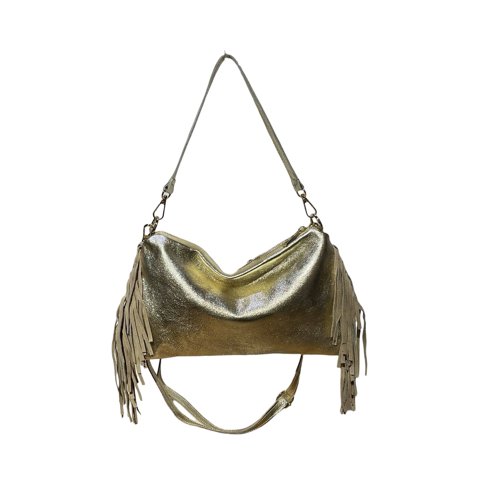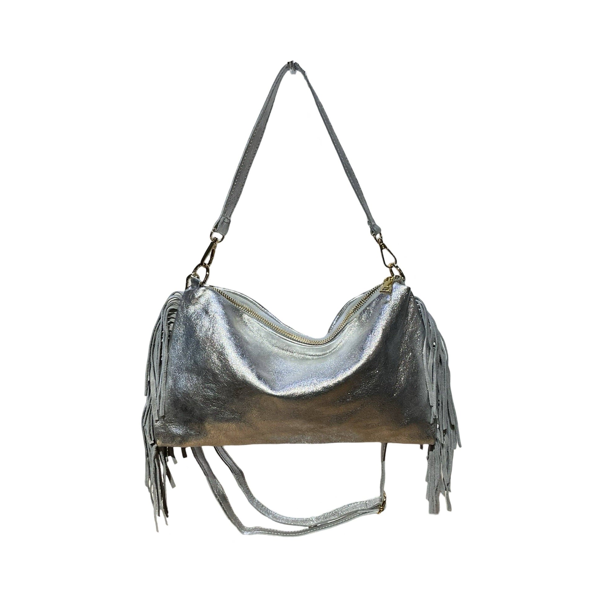 A unique Italian iridescent leather bag, where the play of light meets the bohemian movement of front fringes for a glamorous and timeless touch. * Reference: LV012 * Dimension: 33CM X 19CM X 2CM * Material: Iridescent cowhide leather * Lining: Textile * Made in Italy