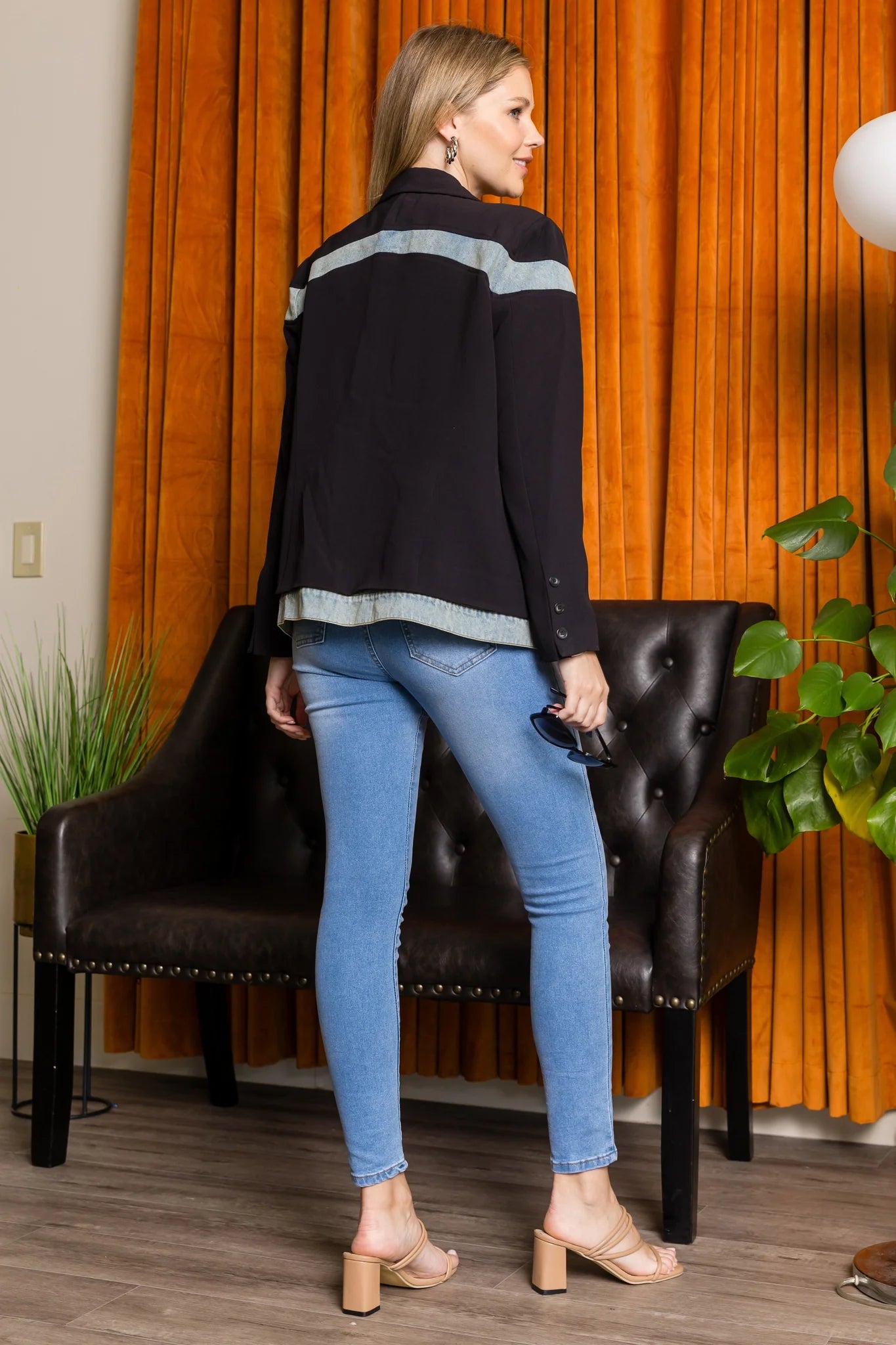 The Jenna Jacket is a versatile piece of outerwear, perfect for any occasion. With its color block design and denim peekaboo detailing, this woven blazer adds a touch of style to any outfit. The front button, button cuffs, and pocket squares provide functionality and a professional touch. A must-have for any wardrobe.