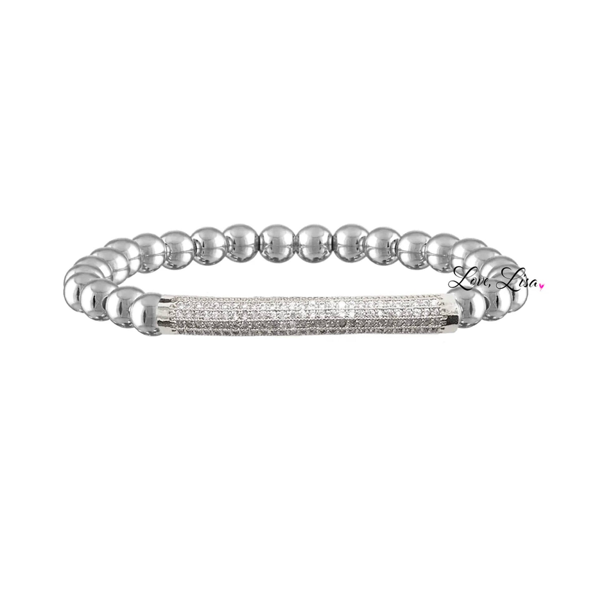 The bar bracelet is such a great basic to own! It's handmade with beautiful 6mm beads. This elegant bracelet features micro pave brass beads, set in a bar shape for maximum sparkle and shine. The comfortable wear and durable design ensures a long-lasting and eye-catching accessory to wear time and time again, perfect for adding a classic touch of glamour to any look. The bracelet is made with elastic and measures 6.85".