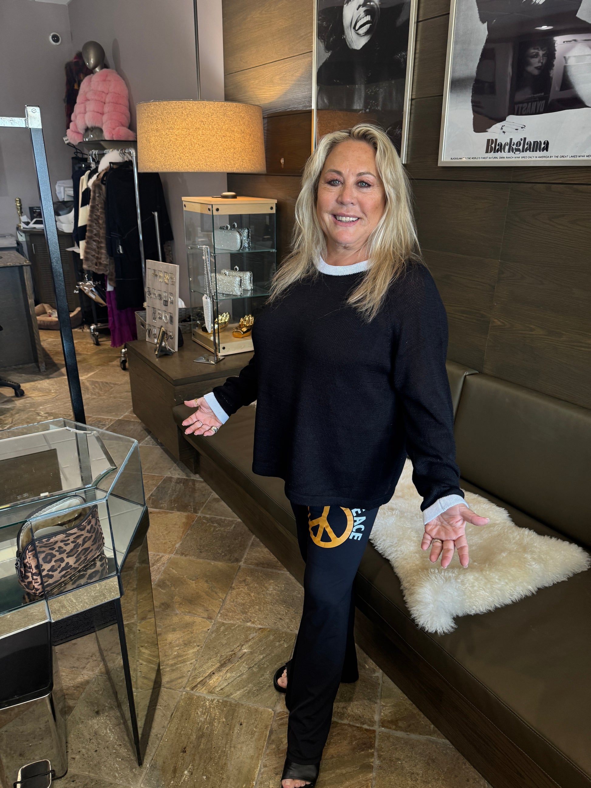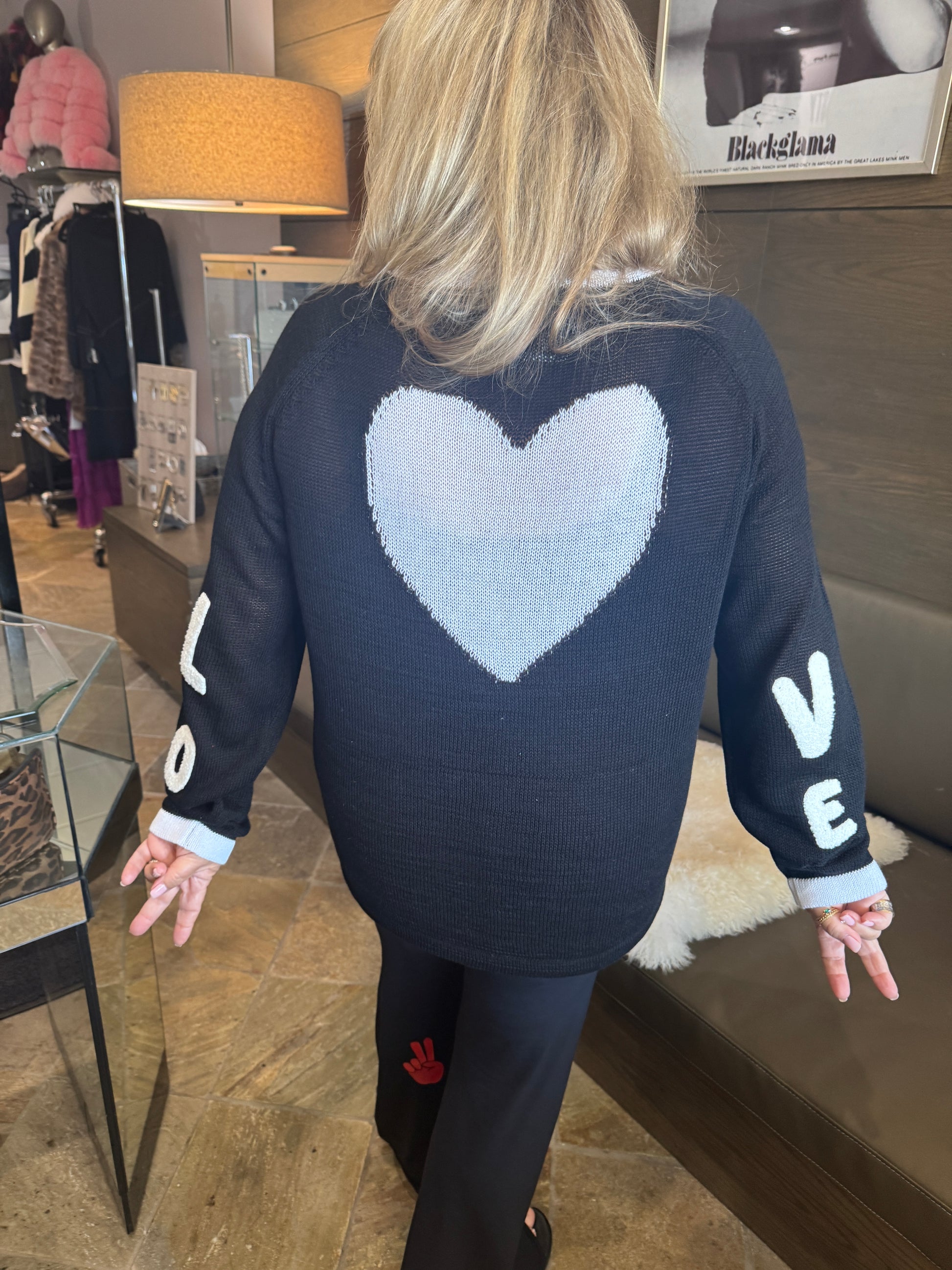 Just Madison Apparel Linen Cotton Mesh Black w/ Love Sleeves and White Heart Back Crewneck Sweater