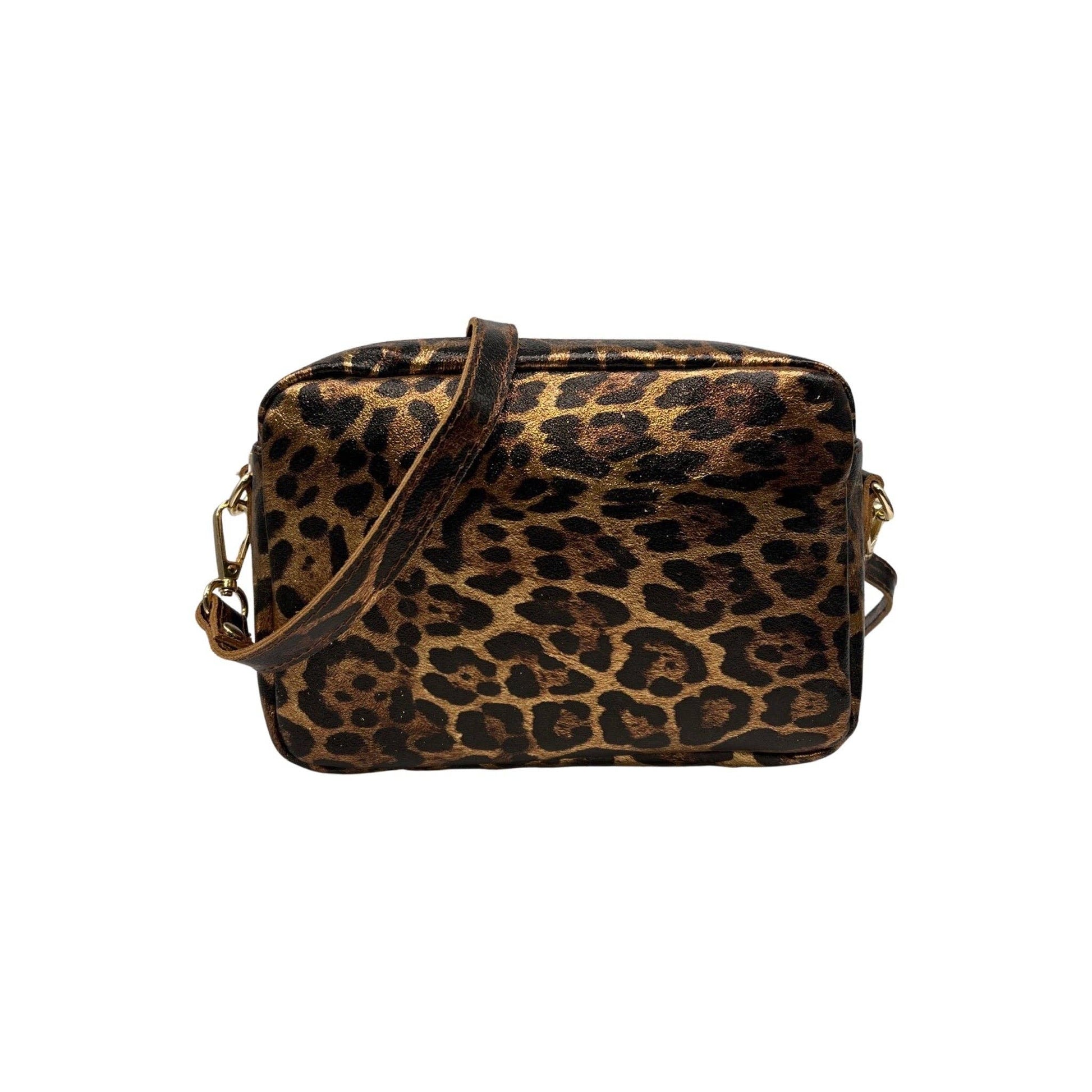 * The Martha bag is made of iridescent leather with a leopard print and has two zippers. Made in Italy, it features a shoulder strap and bronze finishes, combining bold style and Italian craftsmanship for an elegant and modern look. * Dimensions: 21CM X 15CM X 8CM * Reference: LE008 * Material: cowhide leather * Lining: textile * Made in Italy
