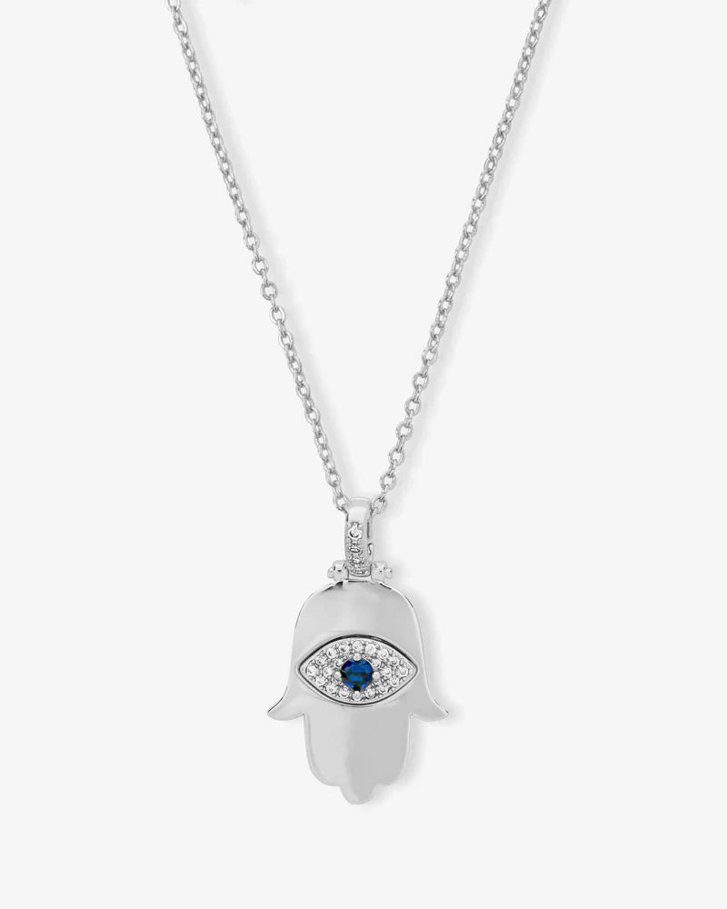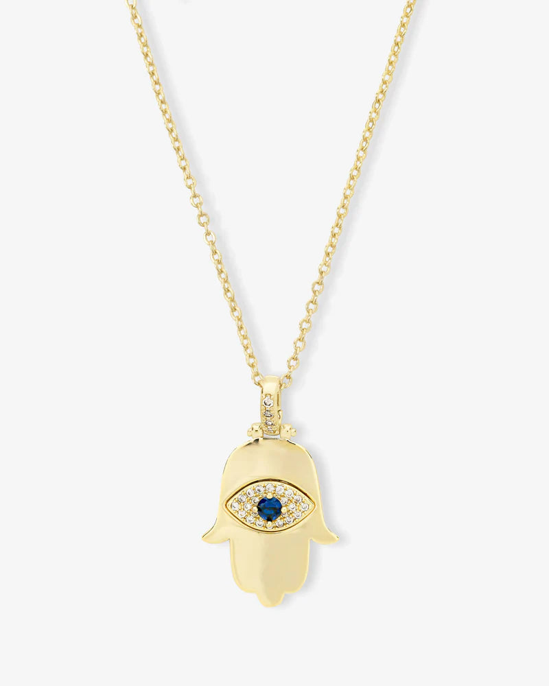 Good Vibes Only! Get your daily dose of power, protection, and strength with our Hamsa Pendant Necklace. This hamsa hand-shaped pendant comes alive with a pavé simulated diamond and sapphire eye. Wear it alone or layered it with other necklaces for a chic modern way to tell your story.