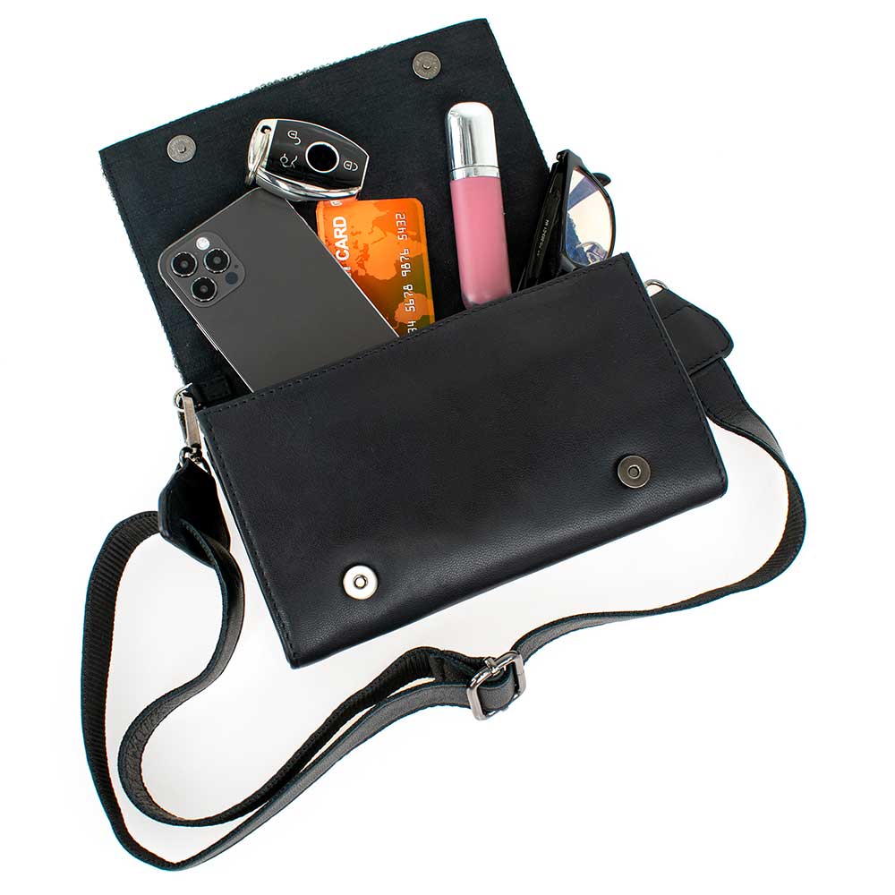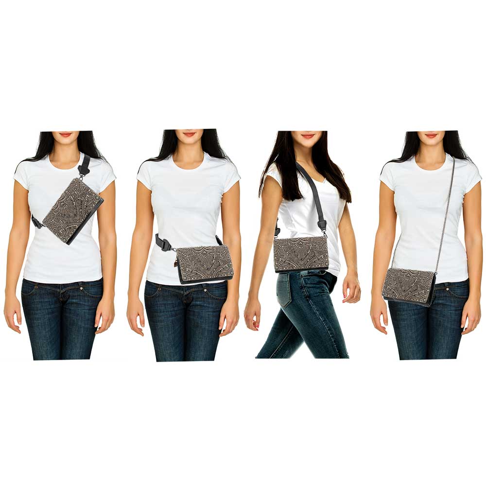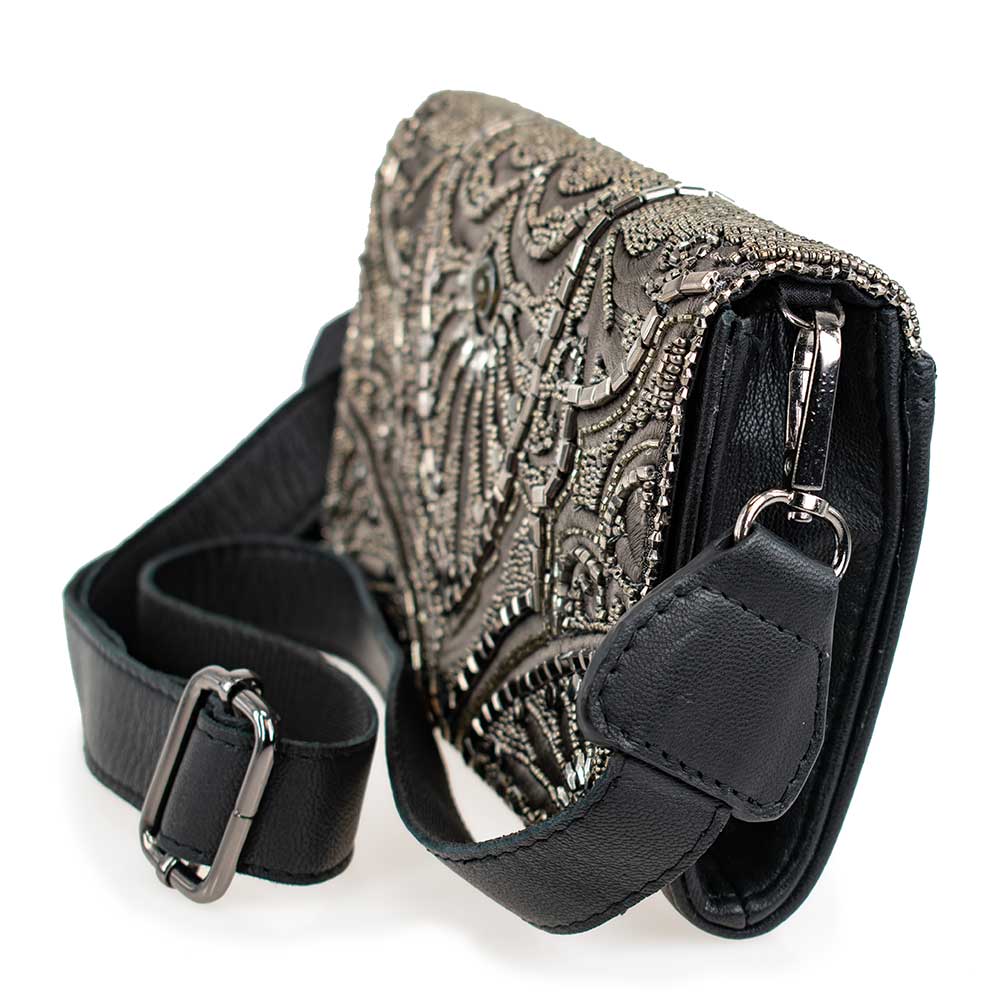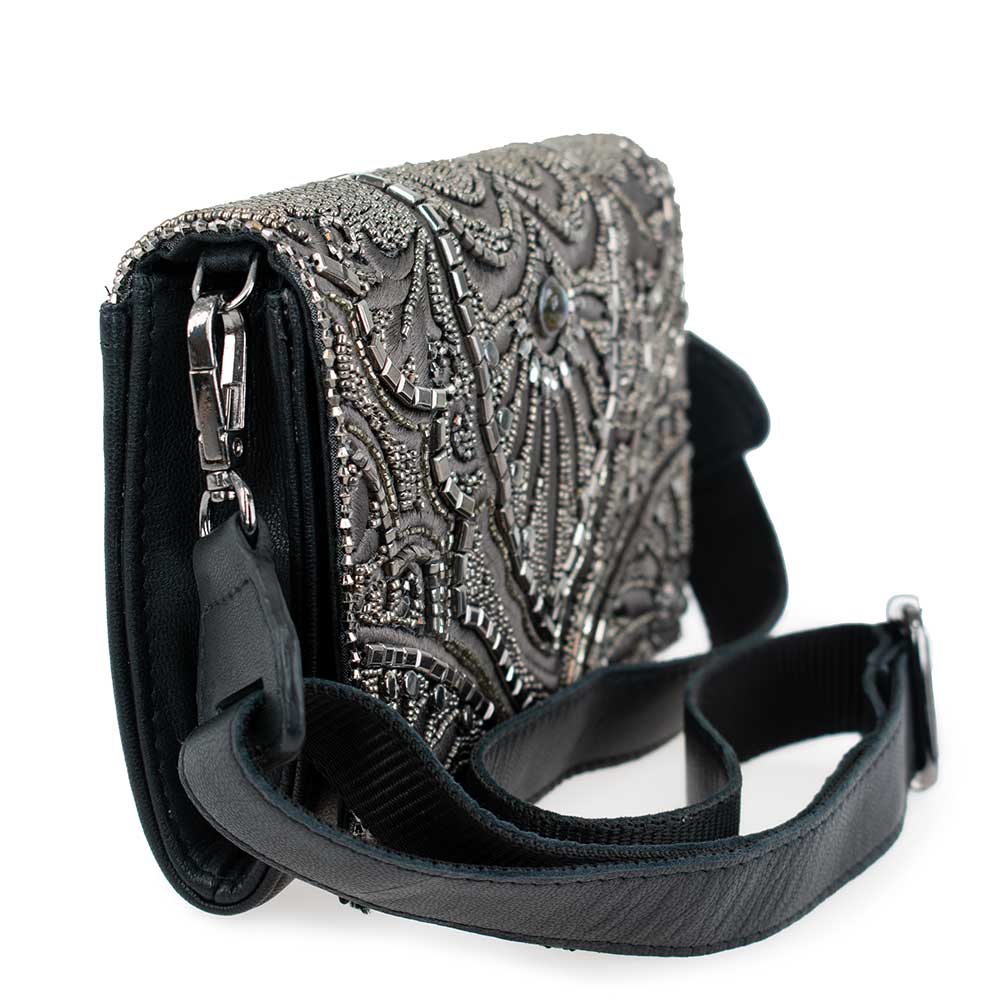Fashion meets function in our new waist bags. Wear it your way with both a crossbody chain strap and an adjustable leather waist strap. Precious Metal is hand-beaded and embroidered in an exquisitely detailed pewter pattern accented with metal embellishments and natural Labradorite gemstones. The soft leather body is comfortable to wear and creates a roomy interior for all your essentials. DIMENSIONS: 8 x 2 x 5", Strap Length: Waist strap: 25-42", Chain Strap: 49", Strap Drop: Waist strap: 11.25-20", Chain Strap: 24", FEATURES: Adjustable leather waist strap, removable crossbody chain strap, magnet closure, inside pocket, back pocket, fits a phone leather purse, handbag, evening bag