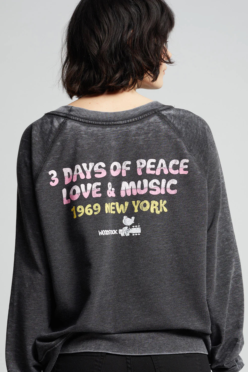 Chill out for "3 Days Of Peace Love & Music" in this Woodstock sweatshirt. The front features "Woodstock" with their bird + guitar logo, and a sun graphic with "3 Days Of Peace Love & Music" "1969 New York" on the back. Made with soft vintage washed fabric, a wide crew neckline, ribbed hems, and an oversized fit.