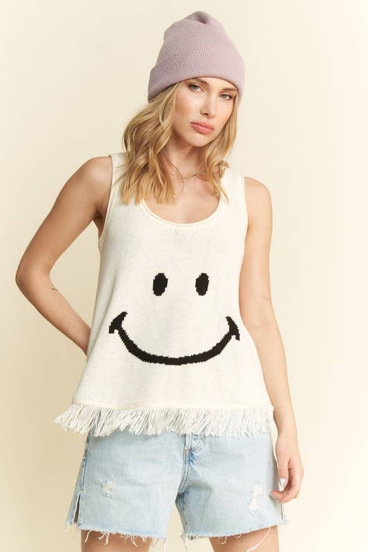 Round neck -Fringe all around on the bottom -Sleeveless - Creme