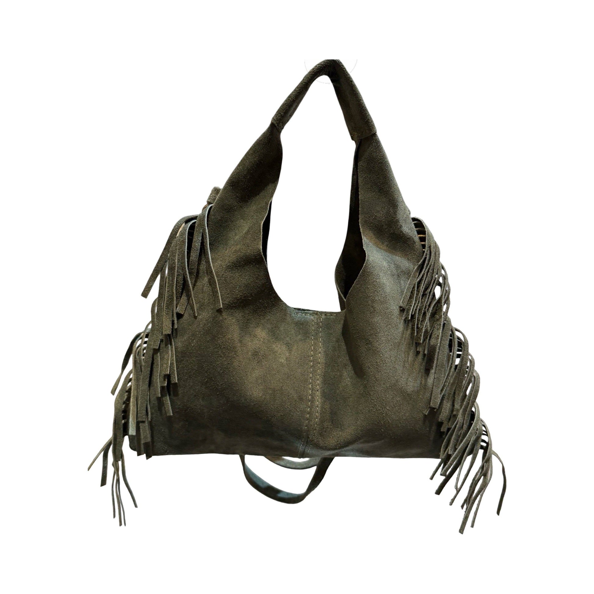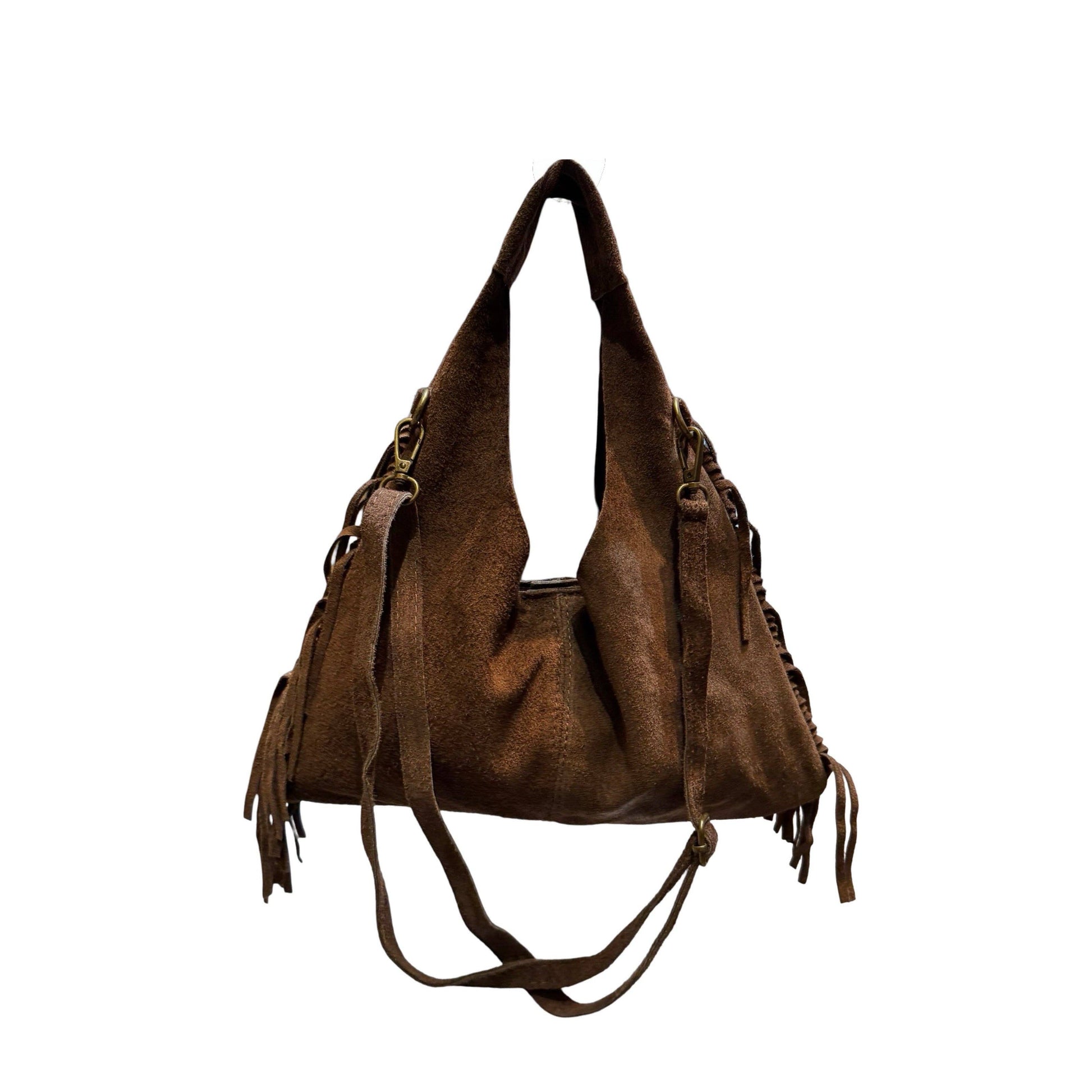 Explore the perfect blend of suede leather and bohemian fringes with this irresistibly charming shoulder bag. Designed for those seeking to combine casual elegance and functionality, this model adds a touch of originality and movement to all your outfits. * Dimension: 35CM X 18CM X 2CM * Reference: LD083 * Material: Suede cowhide leather * Lining: Textile * Made in Italy