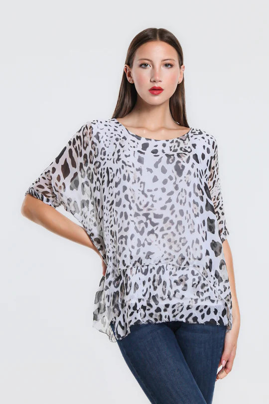 This easy-fit top with elbow length sleeve, is perfect for a night out! Sheer sleeve and flirty layered hem add a touch of femininity, while the buttery-soft viscose lining will keep you comfortable all day! Made in Italy.