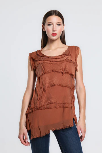 Ruffles for days in a flattering asymmetrical hem! This pretty scoop neck can work forward or back if you want a higher neckline. Our signature silk overlay is lined with a buttery soft Viscose, which means you will be comfy all day and night! Pair her with your favorite jeans for a daytime look or one of our flowy silk pants or skirts for dressier occasions. Made in Italy.