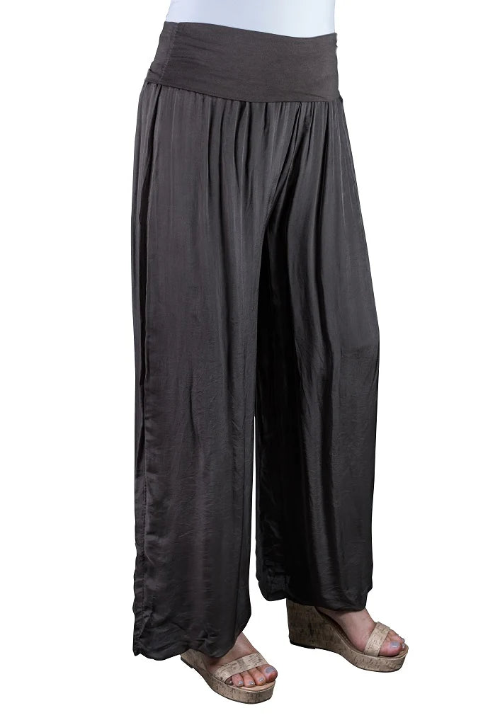 Simple elegance is exactly what you will get with this silky pull on pant. Washable silk overlay drapes effortlessly, while the buttery Viscose lining gives you coverage. This wide-leg trouser is a perfect pairing with any of our silk blouses. The waistband allows you to leave it up for a flawlessly smooth line, or fold down and wear lower on the hip if you wish. Made in Italy.
