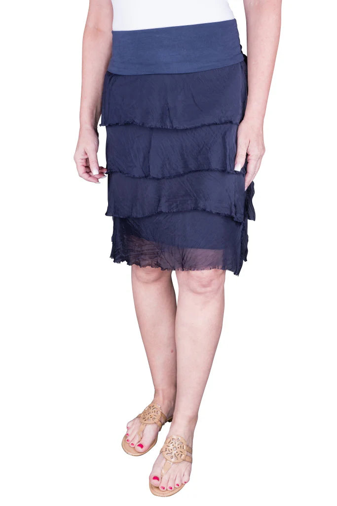 You never know what life will bring when you step out for the evening, but with the Marisa ruffle skirt, you will be ready! Playful and fun, the tiers of silk ruffles dance as you walk, and the buttery soft lining means you are comfy all night. Let the adventure begin! Made in Italy.
