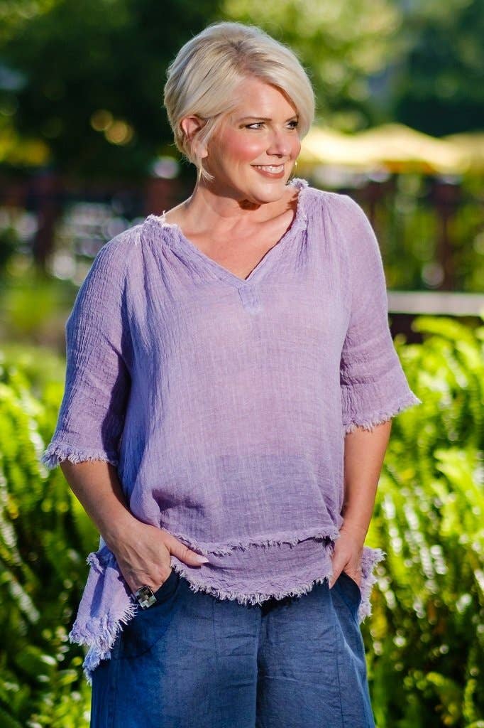 Easy breezy crinkle linen will have you comfy all day! This chic tunic hits all the right fashion notes! Flattering V-neck, soft, raw-edge details, and a swingy double edge hem add details galore. Wear alone, or layer with a tank or cami when the weather gets cool. Made in Italy. • Lightweight fabric • Pretty crinkle texture • V-Neckline • 3/4 sleeve • Raw edge detailing • Easy over the hip length • One size fits most (REALLY!) *2 – 12/14 • Machine wash cold, delicate, with like colors. Lingerie bag recommended. Hang or lay flat to dry.